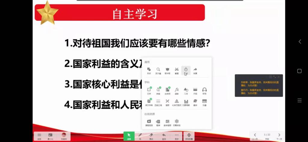 课上,各位老师以全新的教学理念为大家呈现了一节又一节精彩纷呈的网课。教学过程中充分体现了学生的主体地位,注重引导学生自主学习,培养他们发现问题、解决问题的能力,体现了师生之间的主导与主体作用。熟练的教学内容,娴熟的教学技能,富有激励性的课堂用语使每位同学深受感染。