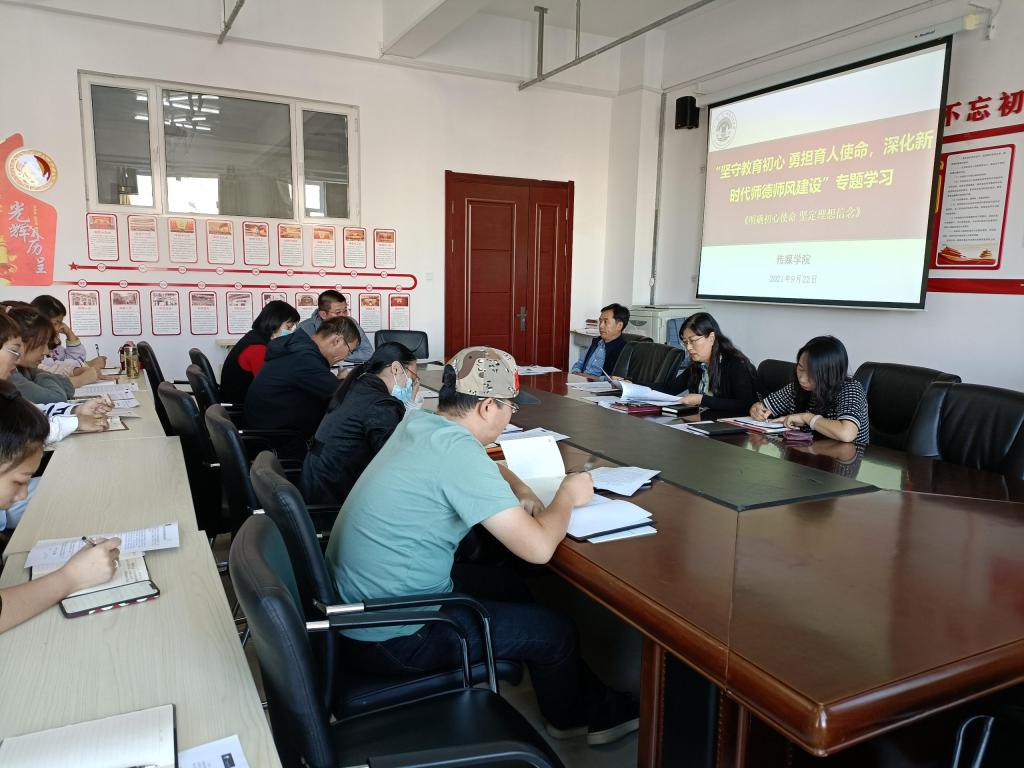 为了进一步推进师德师风建设常态化发展,更好的贯彻习近平总书记关于教育的重要论述和全国教育大会精神,按照永利yl23411集团官网举办“坚守教育初心 勇担育人使命,深化新时代师德师风建设”专题网络培训的部署,9月22日下午,传媒学院领导班子带领学院全体教职工在崇文楼A420会议室开展师德师风专题学习。
