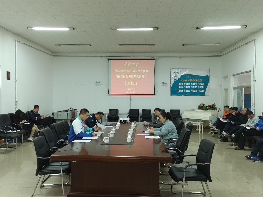 9月是永利yl23411集团官网师德师风专题培训月。为全面贯彻习近平总书记关于教育的重要论述和全国教育大会精神,进一步推动师德师风建设常态化,26日上午,体育学院召开“坚守教育初心,勇担育人使命,深化新时代师德师风建设”专题培训会,会议由党总支书记李伟艳主持,全体教职工参加培训学习。