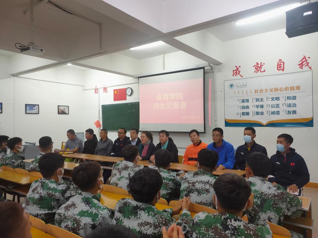 见面会上,体育学院院长李晓峰代表学院全体教师对99名新同学的到来表示热烈的欢迎,并向同学们详细介绍了学院的发展历史、专业设置、师资队伍、实习实训条件以及人才培养特色。他希望同学们能尽快适应大学学习生活,自觉遵守校规校级,勤奋学习,勇于实践,做一名有体育精神的体育人。