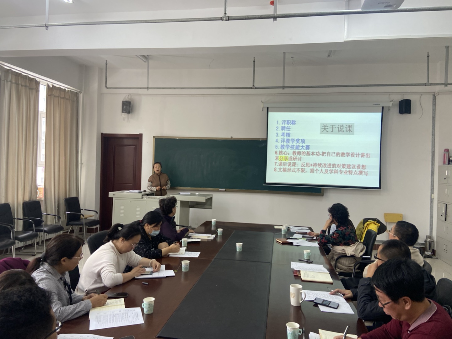 于晓梅教授结合师范专业认证的“OBE”理念进行了详细的解读,全面剖析了师范专业认证的核心“学生中心、产出导向、持续改进”,并强调要把“OBE”理念贯穿于教育教学各环节。随后,于晓梅教授从课堂教学质量评价出发,按《呼伦贝尔学院课堂教学质量评价》标准,对教学设计、组织教学、教学方法等教学活动中需要注意的问题,给出了建议和指导;结合《呼伦贝尔学院说课(教学设计)质量评价》标准,从课程思政、教学理念,教师基本功、学习目标与内容、学生情况、过程与方法六个维度对说课进行了详细的解读。