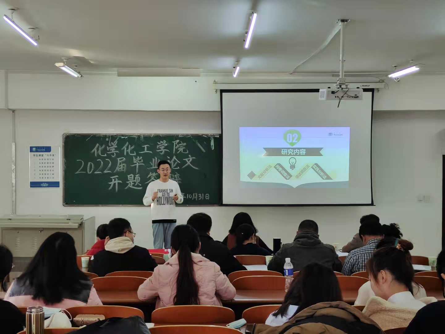 10月31日上午,化学化工学院在科技楼323教室开展了2022届毕业生毕业论文开题答辩工作。化学化工学院全体毕业论文指导教师参加。化学化工学院院长白晓艳任答辩工作组长,化学化工学院副院长毕瑞金任副组长。
