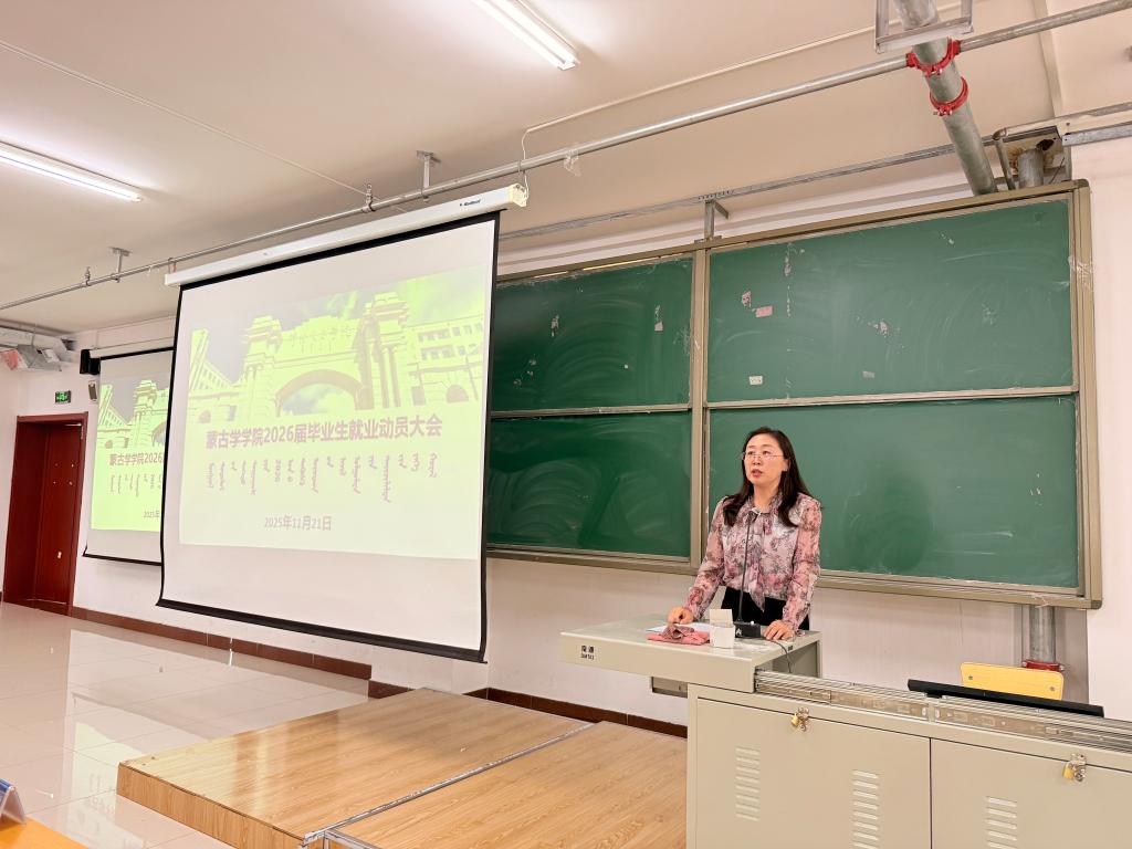 为给毕业生提供清晰明确的方向指引,助力其实现高质量就业,11月21日下午,蒙古学学院在崇文楼B401教室举办2026届毕业生就业动员大会。学院党委书记格根塔娜、党委副书记孔春艳、团学办主任额尔布乐图、教师曾千雨以及全体2026届毕业生齐聚一堂,共同深入剖析当下就业形势,探寻个人发展路径。