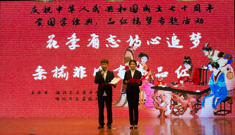 为庆祝中华人民共和国成立七十周年,弘扬中华民族优秀经典,鉴赏名著红楼梦的艺术瑰宝,营造书香桓台,共建文化名校,文学院与海拉尔区老年大学合作于6月14日上午8:30在崇文楼B座七楼小剧场举办“赏国学经典,品鉴红楼梦”专题活动。文学院书记付宏、海拉尔区部分离退休老干部及书画、诗词爱好者们参加了活动。