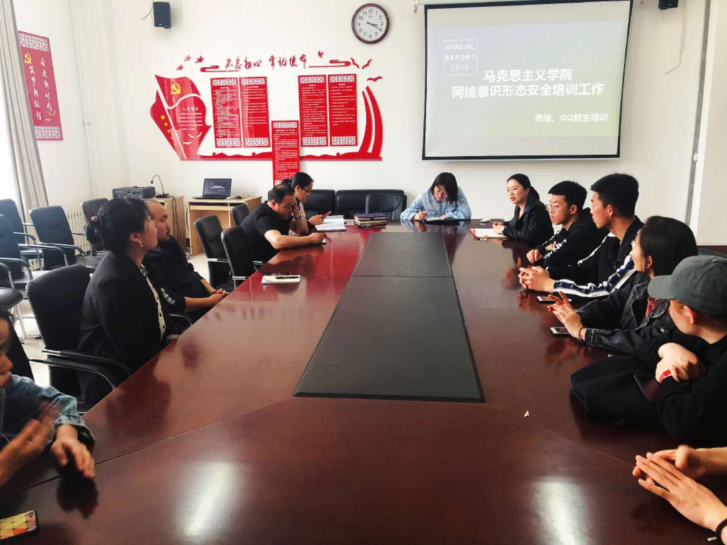 5月15日下午,马克思主义学院在崇文楼B座123会议室召开了网络意识形态安全培训工作会议。会议由学院副院长李俏主持,教工微信群、QQ群群主及学生微信群、QQ群群主参加了会议。