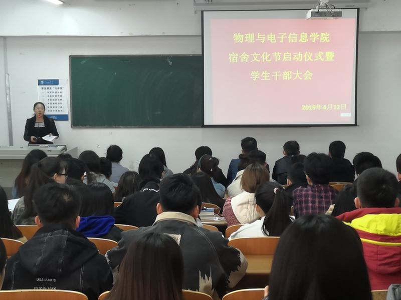 为了加强物电学院学生的文明修养,提高学生自我管理、自我服务及自我教育的能力,丰富大学生宿舍文化生活,培养良好的生活方式、学习态度、行为规范,物理与电子信息学院于4月12日,在科技楼223教室举办大学生宿舍文化节启动仪式暨学生干部大会。参加会议的有物电学院全体学生干部,学工办主任丽丽主持启动仪式。