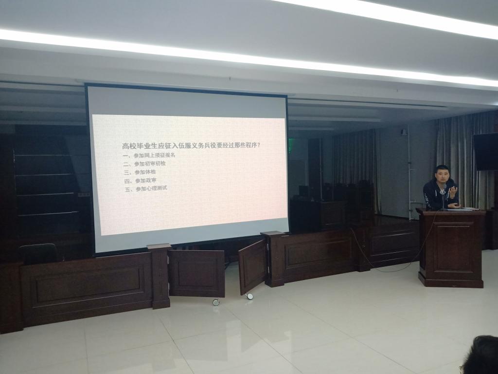 张乐老师入伍多年,退伍后来到呼伦贝尔学院工作,做学生工作至今已经有14个年头了,是个精神面貌极好的帅大哥。讲座中,他给同学们讲了许多军人的故事,向同学们详细介绍了大学生参军入伍的优惠政策、征集的具体时间、程序以及征集条件,从身体到心理,面面俱到,现场还与同学们进行了积极的互动,对同学们提出的问题做了详细的解答。