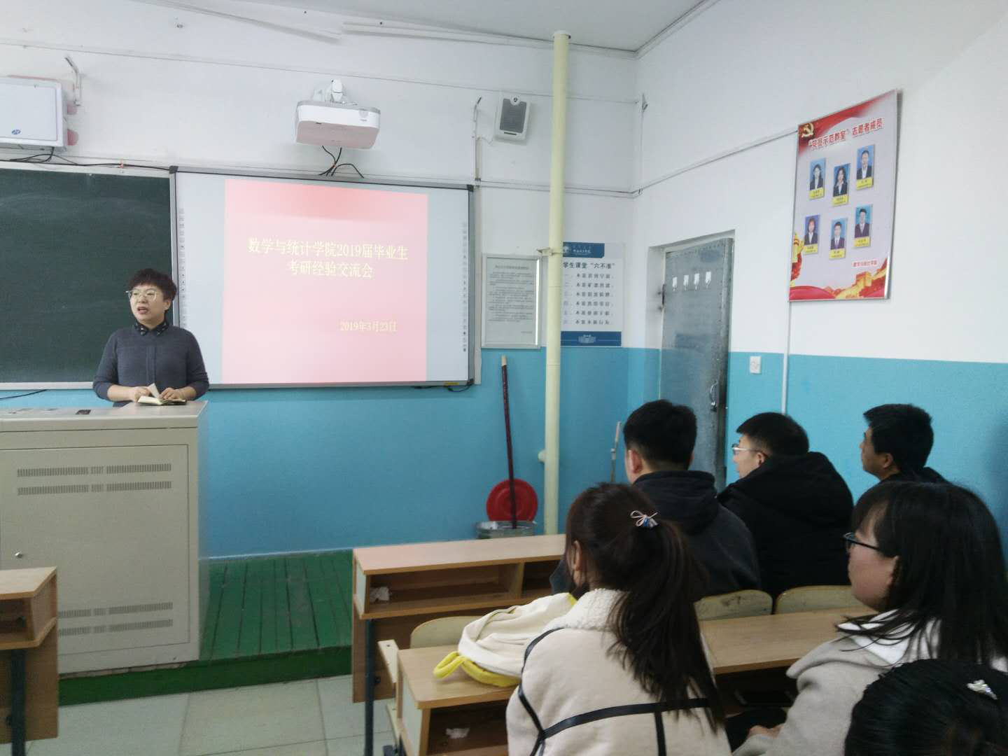 3月23日上午,数学与统计学院在笃学楼405教室组织召开2019年考研经验交流会,数统学院院长万阿英、系主任杨金英、宋旭霞、张志莉、实训中心主任包来友及2015级考研学生参加了会议,会议由万阿英院长主持。