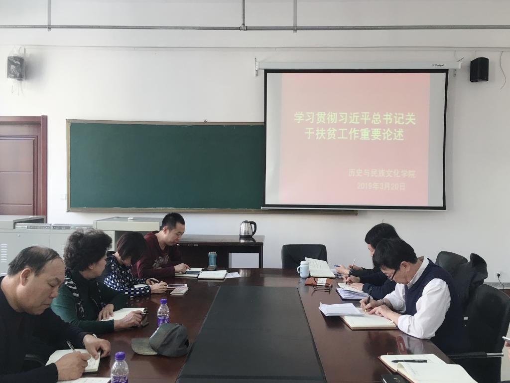 3月20日,历史与民族文化学院党总支教工支部根据上次组织的学习要求,组织支部全体党员学习习近平总书记关于扶贫工作的重要论述。学习活动由支部书记赵金辉同志主持,学院领导班子成员及教工支部全体党员参加了学习。