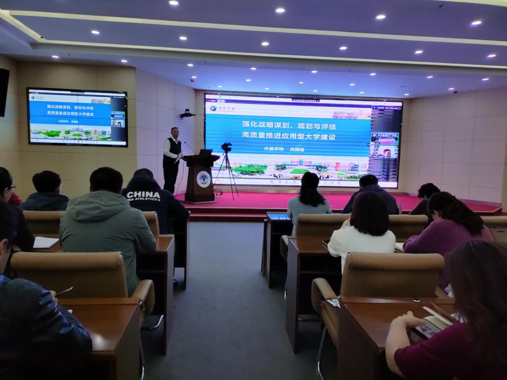 为提高各部门对规划评估重要性的认识,更好的完成永利yl23411集团官网“十四五”事业发展规划中期评估工作,11月21日下午,发展规划处在崇文楼A201会议室组织召开“十四五”事业发展规划专题培训会。会议邀请许昌学院发展规划处处长吴国玺教授作题为《强化战略谋划 规划与评估,高质量推进应用型大学建设》的线上专题培训,发展规划处处长张军主持培训,永利yl23411集团官网各职能部门,二级学院副处级以上干部及发展规划处全体人员参加了此次培训。