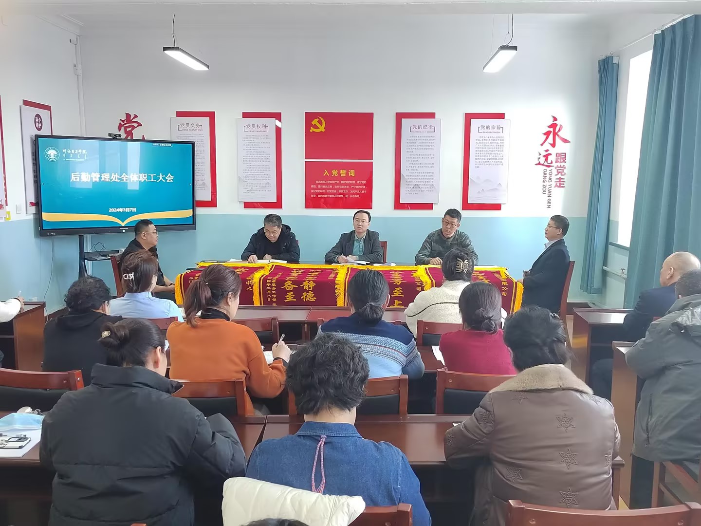 3月7日下午,后勤管理处在外院楼216会议室召开新学期全体职工大会,部门全体工作人员、校内服务企业代表参加会议。