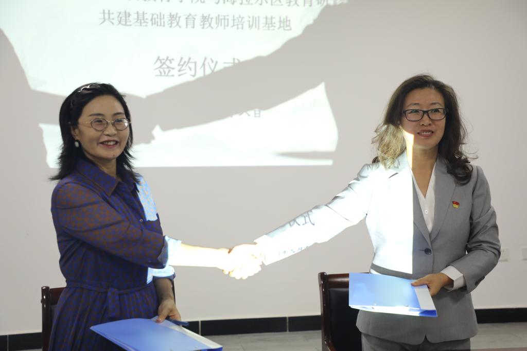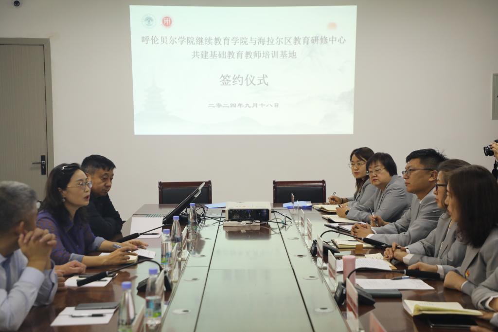 9月18日下午,呼伦贝尔学院继续教育学院与海拉尔区教育研修中心共建基础教育教师培训基地合作协议签约仪式在海拉尔区教师研修中心二楼会议室举行。继续教育学院党总支书记李健、院长莎茹莉及班子成员,海拉尔区教育研修中心主任胡慧婷及班子成员、各科室负责人参加了签约仪式。