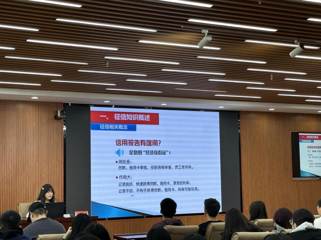 信佳妮为大家分享了征信教育。她从征信的知识、内容、意义入手,分别介绍了征信在日常生活中对大家的重要影响以及征信缺失的危害,教育大家要严格谨慎,养成良好的信用习惯。刘一萱为大家介绍了各种洗钱犯罪活动的“花招”,洗钱的危害以及相关的法律知识,引导大家提高警惕,远离洗钱风险和诱惑。两位工作人员讲解细致认真,中间穿插“有奖互动”,同学们兴趣满满,现场气氛热烈。