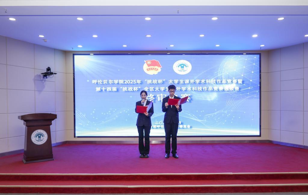 近日,校团委在崇文楼A201会议室举办呼伦贝尔学院2025年“挑战杯”大学生课外学术科技作品竞赛决赛暨第十四届“挑战杯”全区大学生课外学术科技作品竞赛选拔赛。决赛邀请教务处党总支书记艾丽、工学院党总支书记王旭、法学与经济管理学院副院长刘欣、校团委副书记湛楠等7位教师担任比赛评委,团委书记王晓芳出席了比赛,来自学校各学院的40名选手参加了决赛。