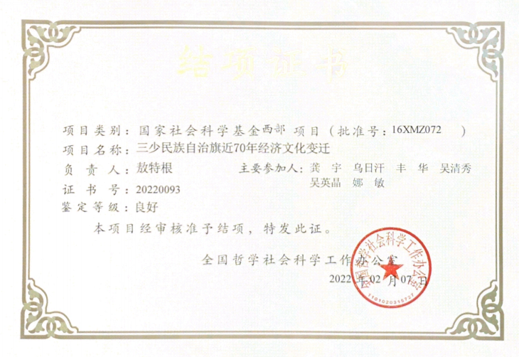 2月8日,全国哲学社会科学规划办公室公布了国家社科基金年度项目、青年项目和西部项目结项情况,永利yl23411集团官网敖特根教授主持的2016年度国家社科基金西部项目《三少民族自治旗近70年经济文化变迁》(16XMZ072)提交的68万字的课题结项成果,经全国哲学社会科学同行专家鉴定评审,最终以良好等级顺利通过结项。近日,结项证书已送达永利yl23411集团官网。这充分展现出永利yl23411集团官网教师的科研素养与能力水平在不断提升;同时对莫力达瓦达斡尔族自治旗、鄂温克族自...