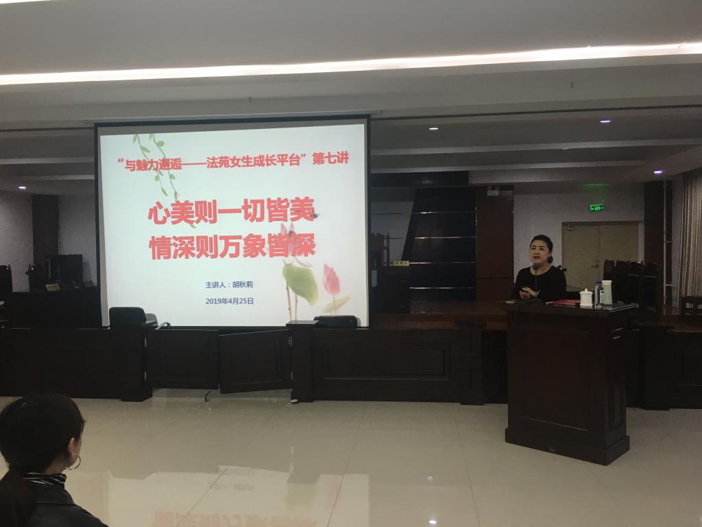 4月25日晚,在崇文楼B座501教室法学院“与魅力邂逅——法苑女生成长平台”开展第七次讲座,特别邀请到校学生处处长、心理学教授胡秋莉老师为全体女生做题为“心美则一切皆美,情深则万象皆深”的讲座。活动由党总支副...