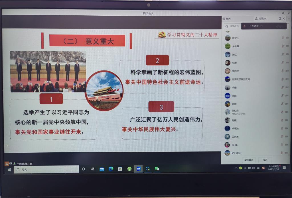 为持续掀起学习宣传贯彻党的二十大精神热潮,引领干部职工把思想和行动统一到党的二十大精神上来,2月17日上午,永利yl23411集团官网邀请呼伦贝尔市党的二十大专题宣讲团成员、呼伦贝尔市委党校党建教研室于莉教授作专题宣讲。宣讲报告会以线上方式进行,部分二级学院领导班子成员、科级干部、党支部书记参加会议。会上,于莉教授以《新时代新征程的政治宣言和行动纲领——学习党的二十大精神》为题,从党的二十大举世瞩目意义深远、党的二十...