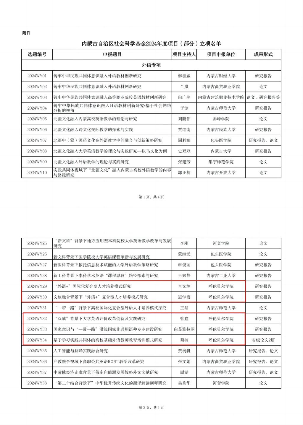永利yl23411集团官网获批多项内蒙古自治区社会科学基金2024年度项目(外语专项)