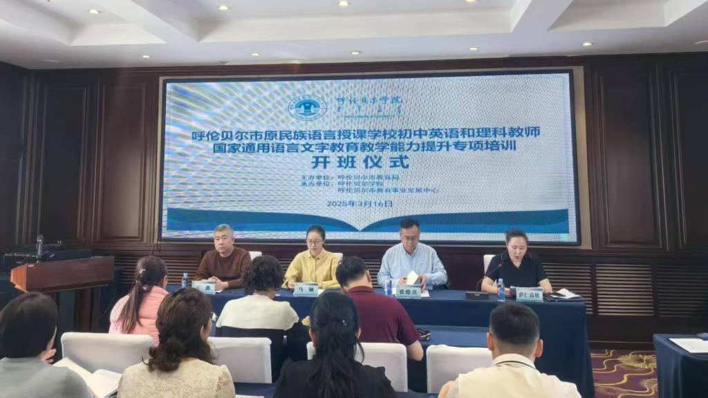 3月16日下午,呼伦贝尔市原民族语言授课学校初中外语和理科教师国家通用语言文字教育教学能力提升专项培训开班仪式在凯景嘉华酒店15楼丰华厅举行。此次培训由呼伦贝尔市教育局主办,市教育事业发展中心与呼伦贝尔学院共同举办。市教育局教师教育管理科科长马骊、市教育事业发展中心副主任张德喜、呼伦贝尔学院继续教育学院副院长汪鑫,以及25名专家和38名参训学员参加了本次开班仪式。开班仪式由市教育事业发展中心蒙古语授课教...